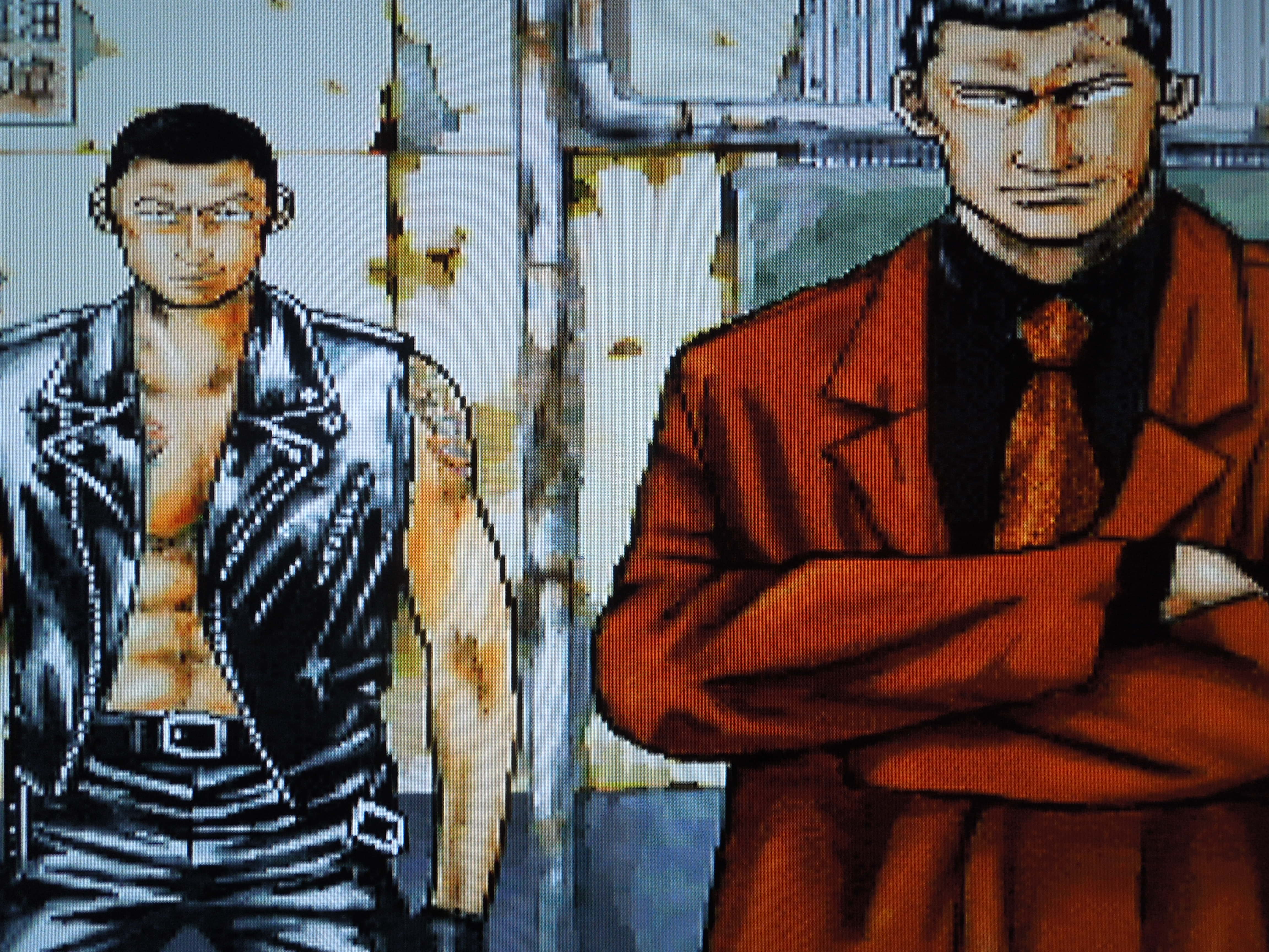 Your special attack is a customizable combo chain.Control: This game makes use of all of the Saturn’s buttons, although you can change the layout in the Options menu. A punches. B kicks. C jumps. X Escapes (slides or dashes quickly in one direction). Y taunts your enemies. Z blocks (you’ll guard for approximately 2 seconds). L uses ‘Combo 1,’ your energy-draining special attack. R uses ‘Combo 2,’ your other energy-draining special attack. You can also execute the combos by pressing either A+B or B+C. You run by double-tapping and holding the direction you’re facing on the control pad. While running, pressing A or B unleashes a flying tackle (Harumichi) or big boot (Rindaman). Jumping, then pressing A or B executes a flying kick (Harumichi) or body press (Rindaman). Additionally, Harumichi can kick opponents while they’re down by tapping A or B while they’re lying prone. If you get in close to an enemy, you’ll automatically grab them. Pressing A after grabbing an opponent will execute a headbutt (Harumichi) or knee smash (Rindaman). Pressing B after grabbing an opponent will throw them – you can knock down approaching enemies by throwing a thug into them. You can also pick up sticks or pipes – A swings them at enemies, and B throws them at enemies. Sometimes, if you get knocked down, you’ll have to tap A to make your character get up – if you don’t tap fast enough, you’ll lose a life.