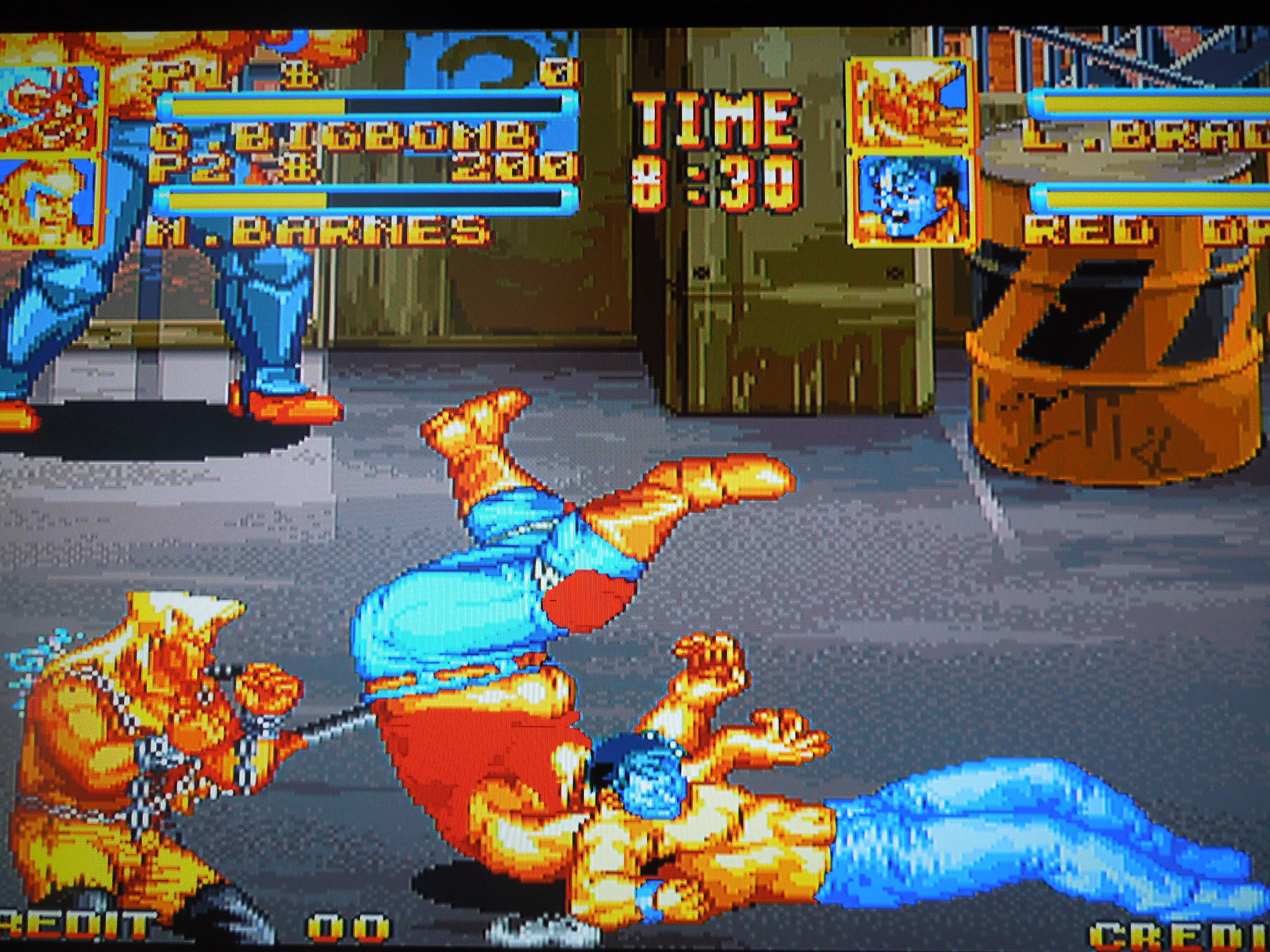 Difficulty: Here’s where everything takes a downturn. You have 4 selectable difficulties: Easy, Normal, MVS (arcade difficulty), and Hard. Select Easy, because it’s the only chance you have. The problem is, once you get to the 3rd match vs. Red Dragon (or 2nd match in co-op vs. Leo Bradlay and Red Dragon), the CPU’s ability to win grapples amps up to approximately 85%, and to make things worse, the CPU attacks RELENTLESSLY. While punching the CPU before locking up in a grapple increases your chances of winning the grapple and pulling off a move, even this can be tough. Your best bet is to go for jumping attacks, off the turnbuckle attacks, and utilizing your wreslters Away, Toward, A dash attack. Tagging in c0-op is a must, as you can regain some energy on the outside, but winning tag matches (after the easy first one) is just as difficult as singles matches, as the CPU’s constant attacking makes it tough for you to even get to your partner. Can the game be beaten? Yes, I have done it multiple times, but only with TREMENDOUS patience and cheap, repetitive tactics. If you can beat all 10 opponents in single player using the game’s unchangeable allotment of 4 credits (meaning you can’t continue more than 4 times following losses), consider yourself the master or 3 Count Bout. Fortunately, if you have a Neo Geo Memory card, you can save the game after you use all of your Credits, then continue from there.
