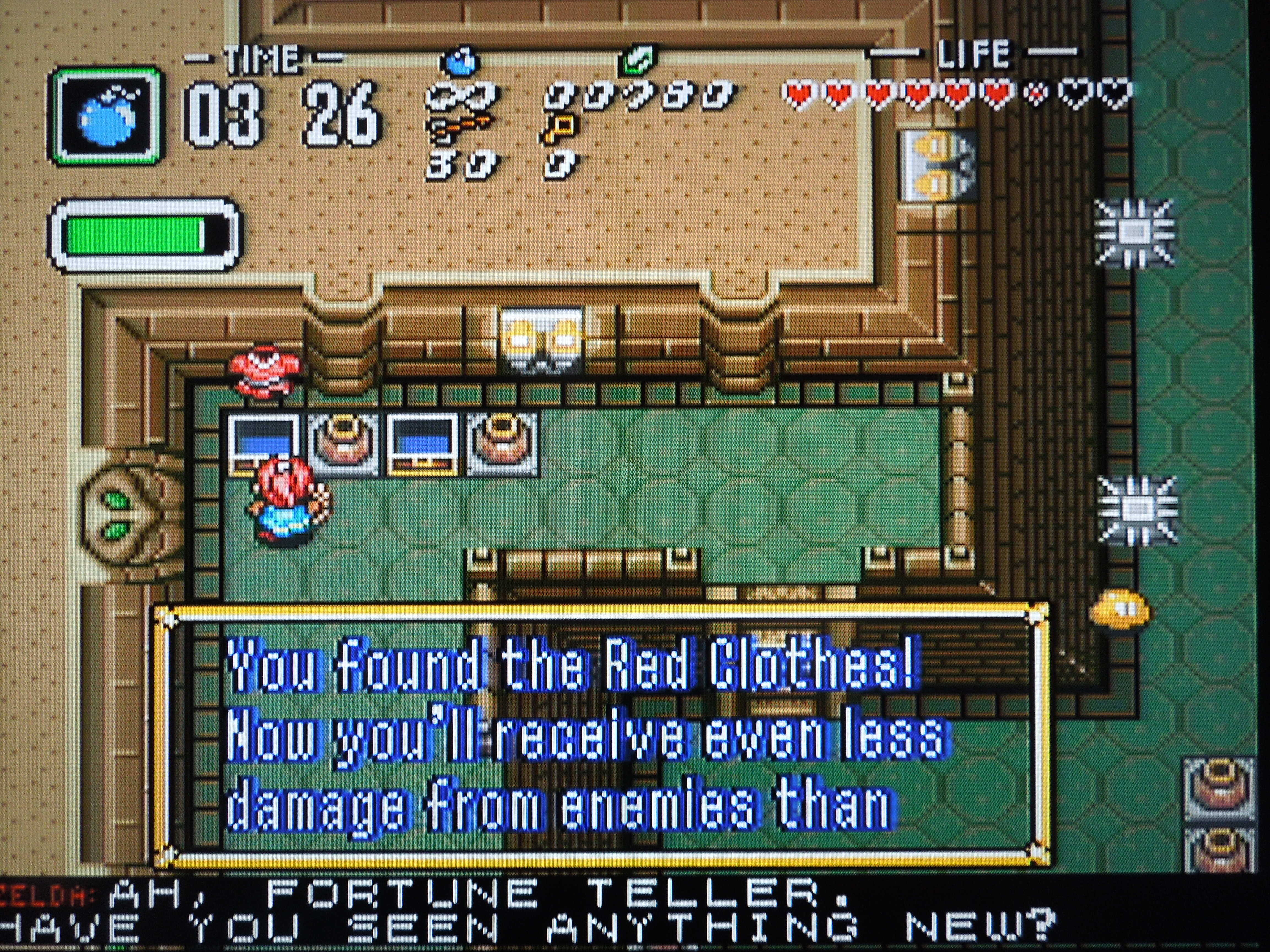 The story begins with the Youth and Aginah the Wise Man waking up in the home of Link.Objectives: You have from 3:06 to 3:56 (the clock is in the top-left corner of the screen) to complete Chapter 3. In this game, you are to collect: 2 Ancient Stone Tablet pieces, 4 Heart Containers (2 Containers must be made by piecing together 8 separate Heart Pieces), the Worn-Out Power Glove, the Normal Power Glove, the Level 3 Sword, the Level 3 Armor (Red Mail), the Fire Rod, and a Magic Bottle. Additionally, you have the option of rescuing the Priest from the river and returning him to the castle, finding the Mole character, renting the Level 4 Sword, and playing the archery mini-game. *Before doing any of this, as Aginah reminds you, you must first use the Flute to return to the first 4 Dungeons, where individual Thieves are located outside the entrances. The Thieves each give you a “bag of trash” that contain the Sword, Boots, Heart Containers, etc. – all items from those 4 Dungeons that were in Chapter 1 and Chapter 2. Visiting the 4 Thieves takes approximately 30 seconds, then you’re ready to truly begin Chapter 3.