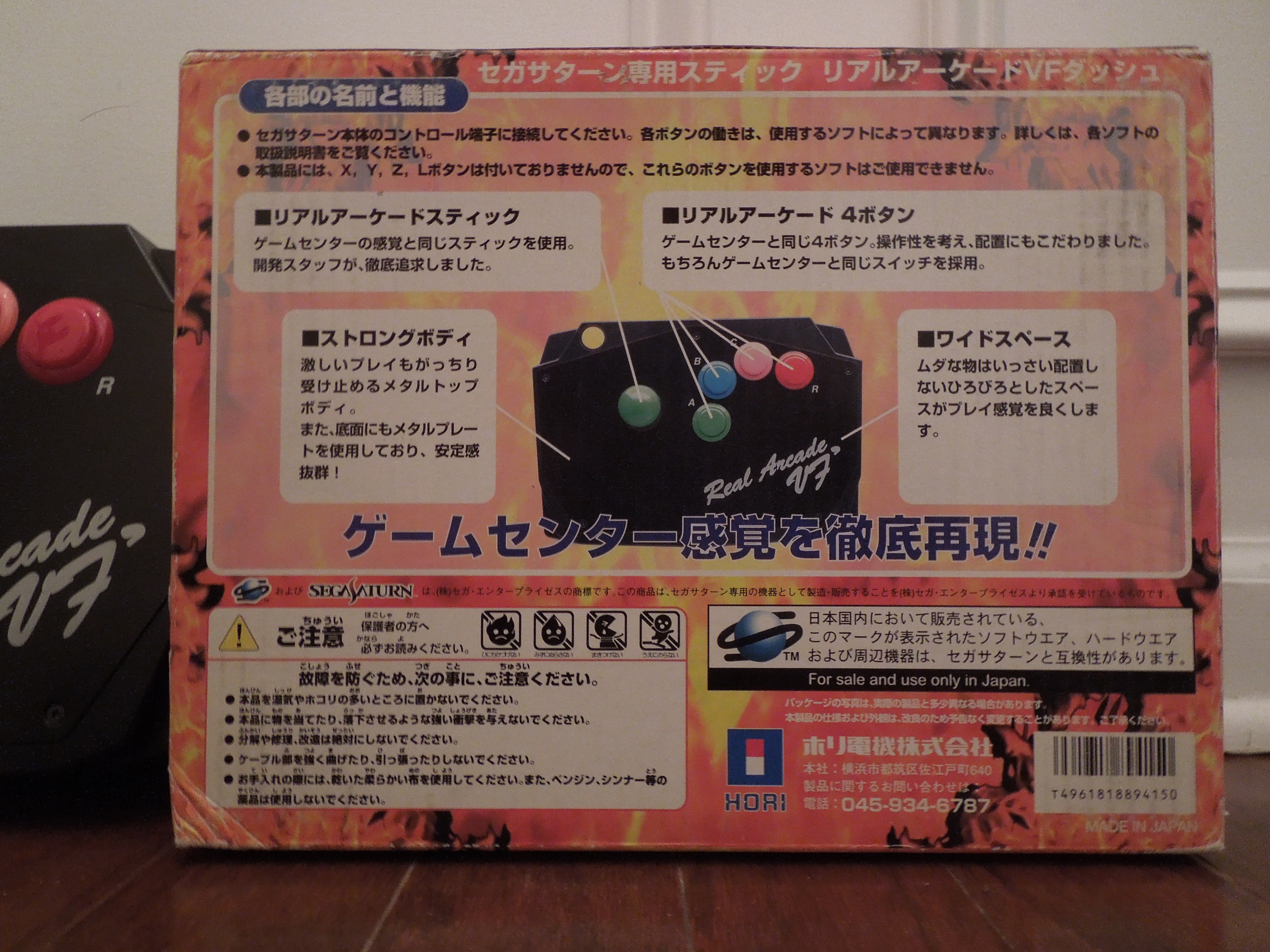 Quick Saturn Controller History: Many different controllers were released for the Sega Saturn home console. The Sega Saturn used 8 buttons (in addition to the control pad and Start button): A, B, C, X, Y, Z, L, R). While the console, released in 1995, included a basic, well-made game pad (and later a 2nd release that changed some things up), Arcade Sicks were soon released to present an alternative way to play Saturn games. The Virtua Stick was the most common. It included all of the necessary buttons, plus turbo switches and an arcade-style stick rather than a control pad. A second controller, the Virtua Stick HSS-0136, was also released (only in Japan). The HSS-0136, released by Hori, was huge and extraordinarily similiar to what you would find in an arcade. It included all 8 buttons, and they were large and round, like those on an arcade cabinent. Also, the control stick was clicky, much like those in the arcade. For many Saturn gamers, the HSS-0136 is the pinnacle of controllers for the Saturn. However, there was another arcade stick that is extremely obscure that was made for the Saturn and was only released in Japan – the Real Arcade VF Dash, model no. HSS-12, which was also made by Hori (a company famous for making great controllers) – this a review of that controller.