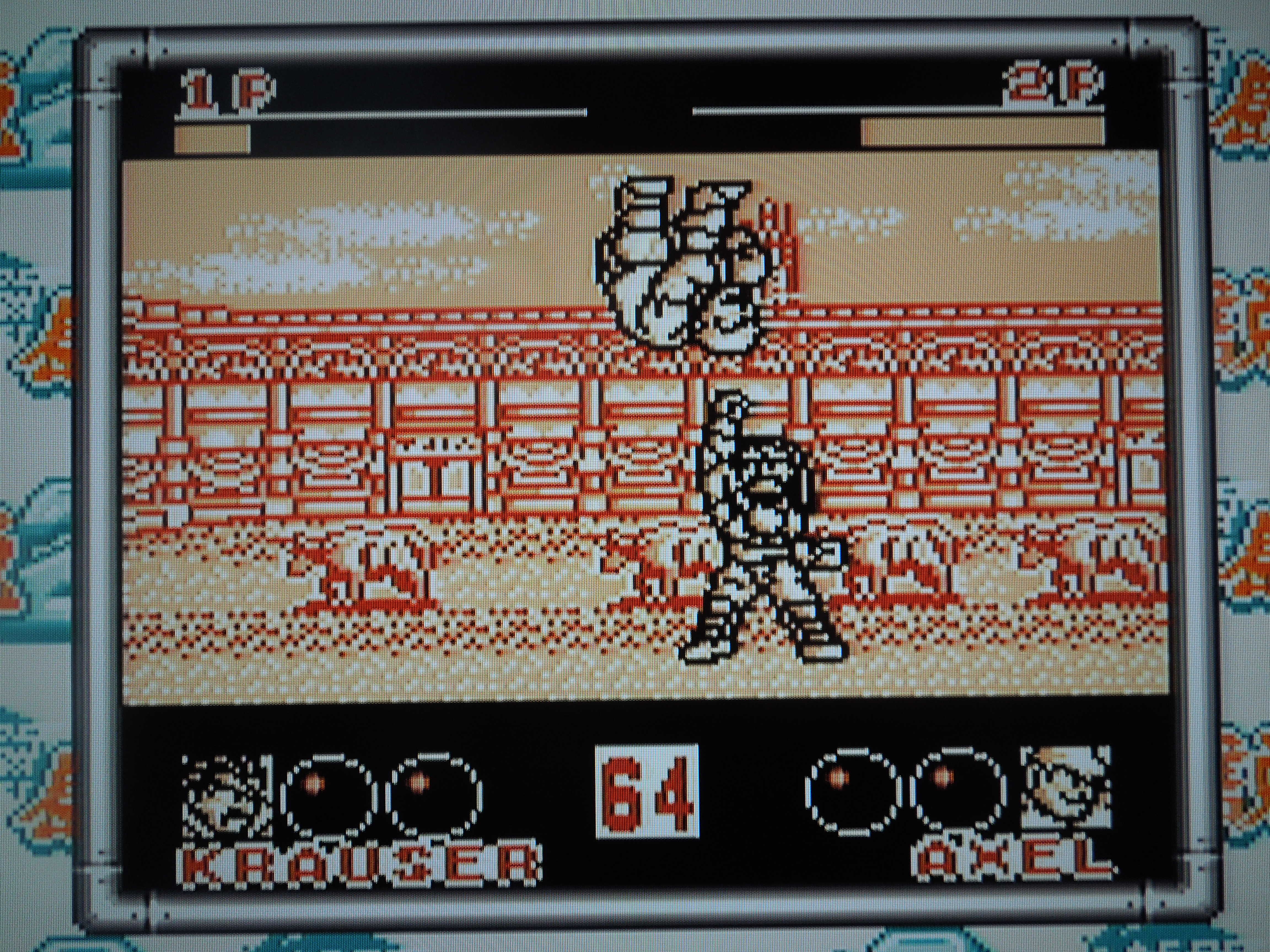 Press Select, Select, Select on the ‘Takara’ intro screen to unlock the 4 ‘boss’ fighters.Basic Control: Start pauses the game during play. Tapping A throws a weak kick; holding A throws a strong kick. Tapping B throws a weak punch; holding B throws a strong punch. Getting in close to your opponent and pressing B executes a throw. Pressing A+B when you’re a little way away from your opponent taunts him or her.