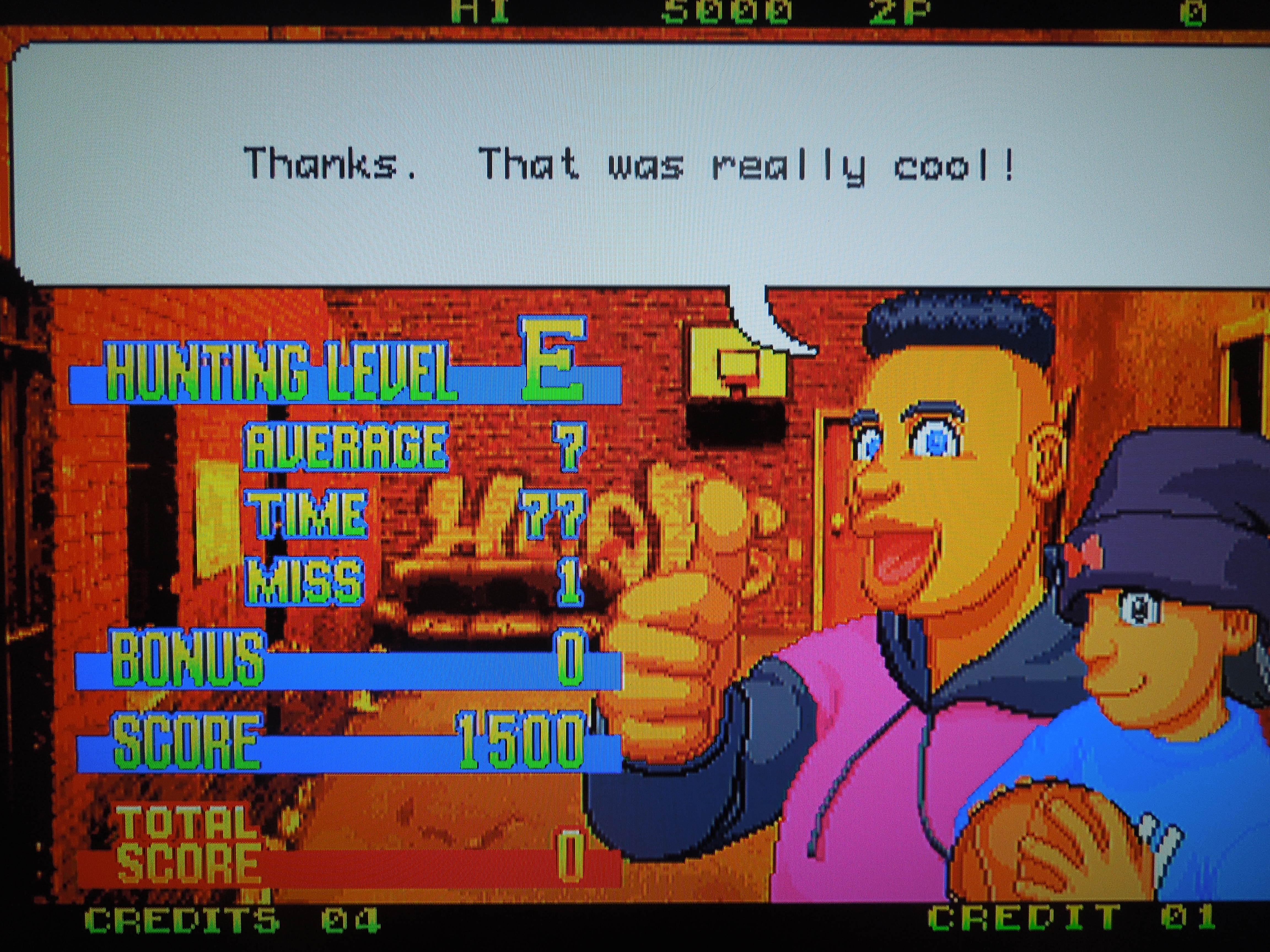 High Score: Your score is given after each opponent you beat in the Best of 3 Rounds battles.  Based on how quickly you dispatched your Red and Blue Ghosts (and therefore your opponent), you’ll get a particular ‘Hunting Level’ (Rank) from A-F, and points for Average (?), Miss (how many times you didn’t catch your ball, I suppose), and Time.  Your score resets after every Credit you use.