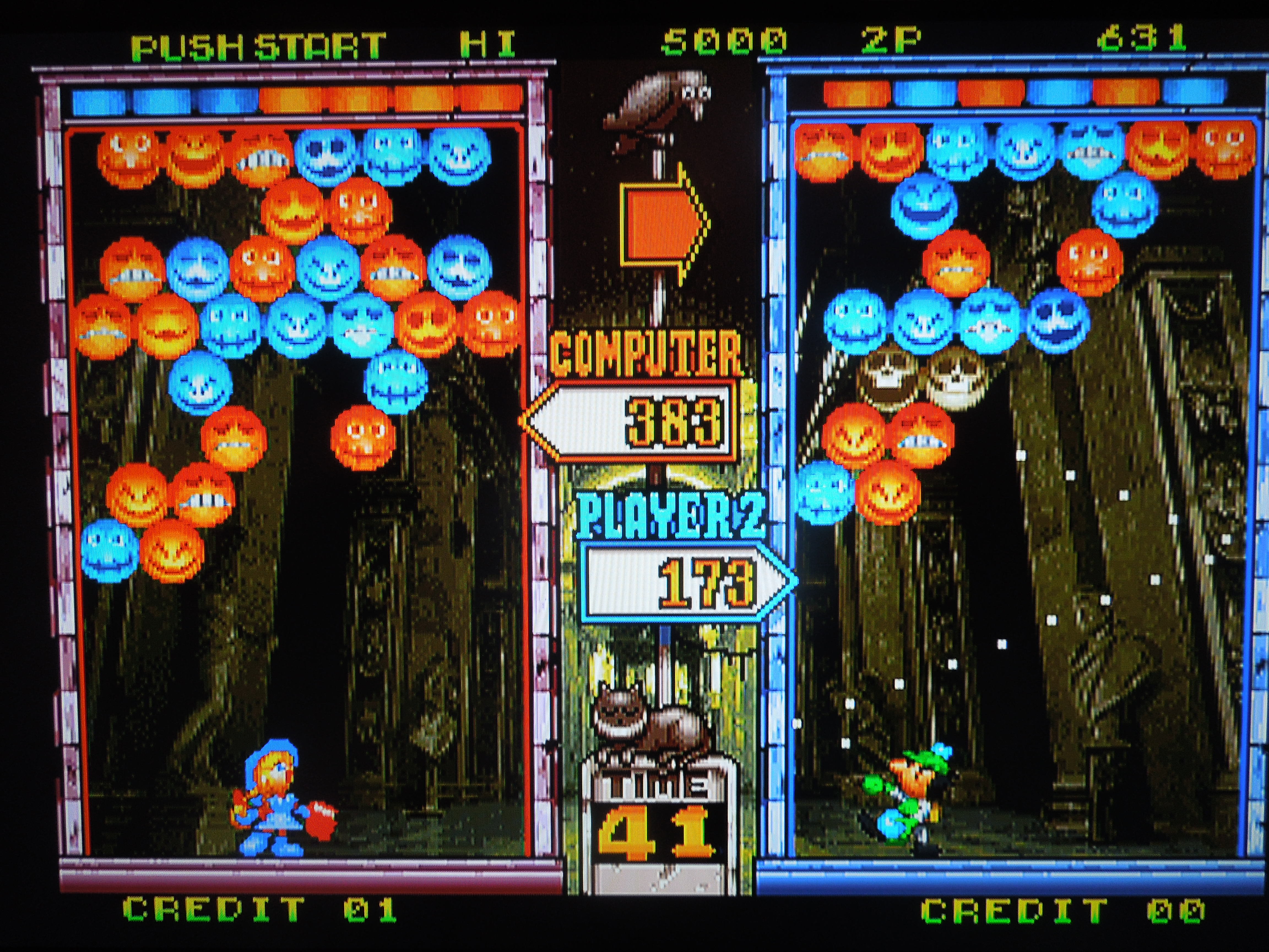 Control:  So, how do you fight the Red and Blue Ghosts in order to beat your opponents?  Button A throws a red ball that destroys Red Ghosts.  Button B throws a blue ball that destroys Blue Ghosts.  By holding the joystick right or left, you can move your character left or right, and once stationary, you can throw either colored ball (you can also change the color of your ball anytime during its flight by pressing the button for the other color) at the Ghosts.  While standing still, you can angle the ball to take out as many Ghosts as you can with a single throw – anytime your ball connects with a Ghost of the same color, that Ghost will disappear, as well as any beside it that are of the same color.  You have to catch the ball when it bounces back your way, however – if you miss and it hits the ground, then an entire line of ghosts will advance.  You can bank the ball off the walls to squeeze it into tight places and take out dozens of ghosts with a single throw – the more ghosts you destroy per throw, the higher your points go.  Additionally, for every ‘large amount’ of Ghosts you destroy on your half the screen, a line of Grey Skulls will appear on your opponent’s screen, making it harder for him or her to attack his or her own Ghosts.  *Note your opponent will do the same to you.  Select pauses the game.