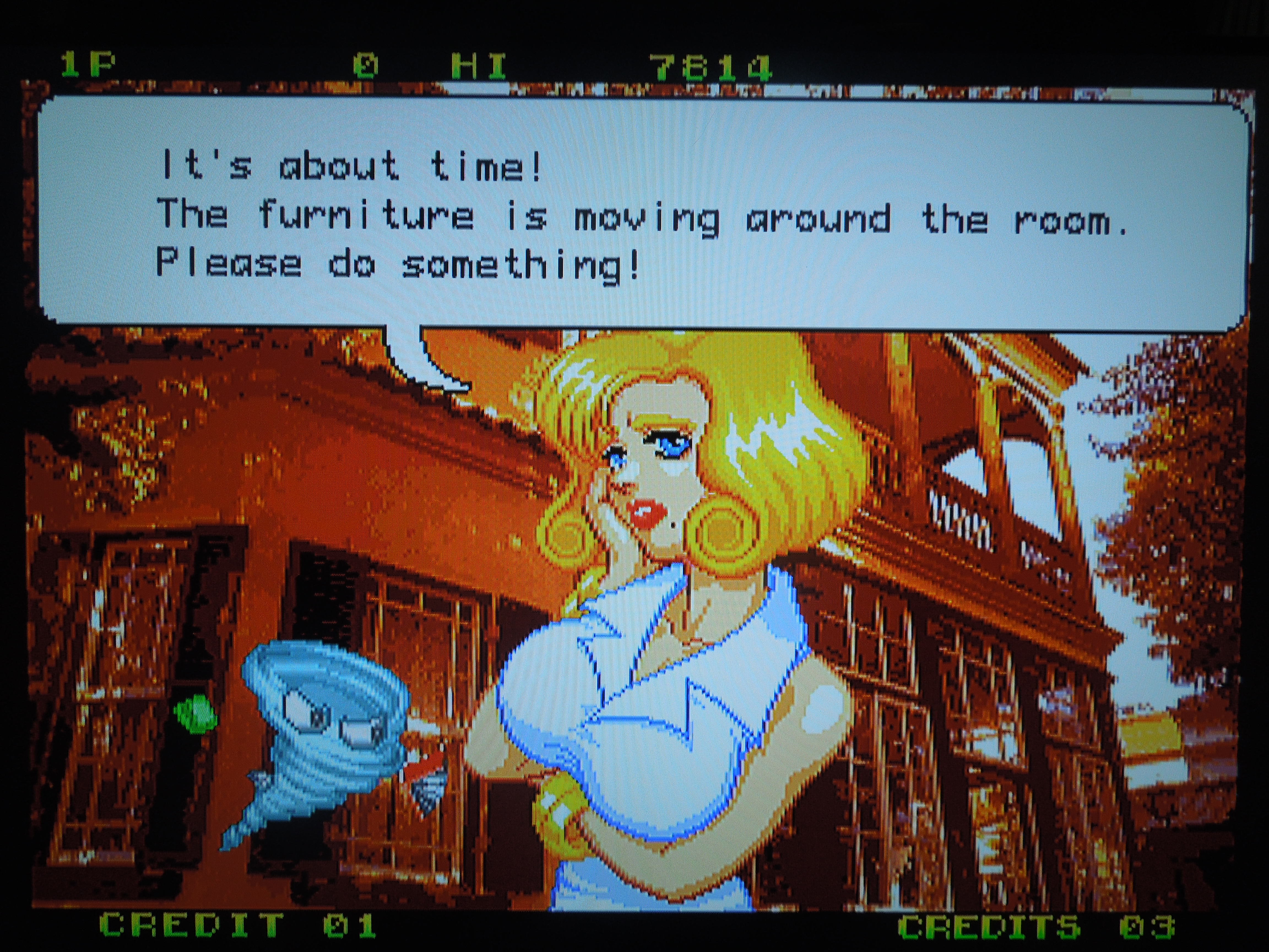 Story: Taken directly from the intro: “Bruce is a ghost hunter.  He works at a company that specializes in hunting and evicting ghosts.  He and his partner, McCoy, work hard every day under the supervision of Rachael, the demanding president.”  I noticed (lookswise) parallels between the game  characters and characters from the popular GhostBusters films.  Bruce has the look of Peter Venkman (tall and thin, brown hair), McCoy of Ray Stantz (a bit portly), and Rachael of Janine Meltinz (with the red hair, although in the game she’s the boss, not the secretary).