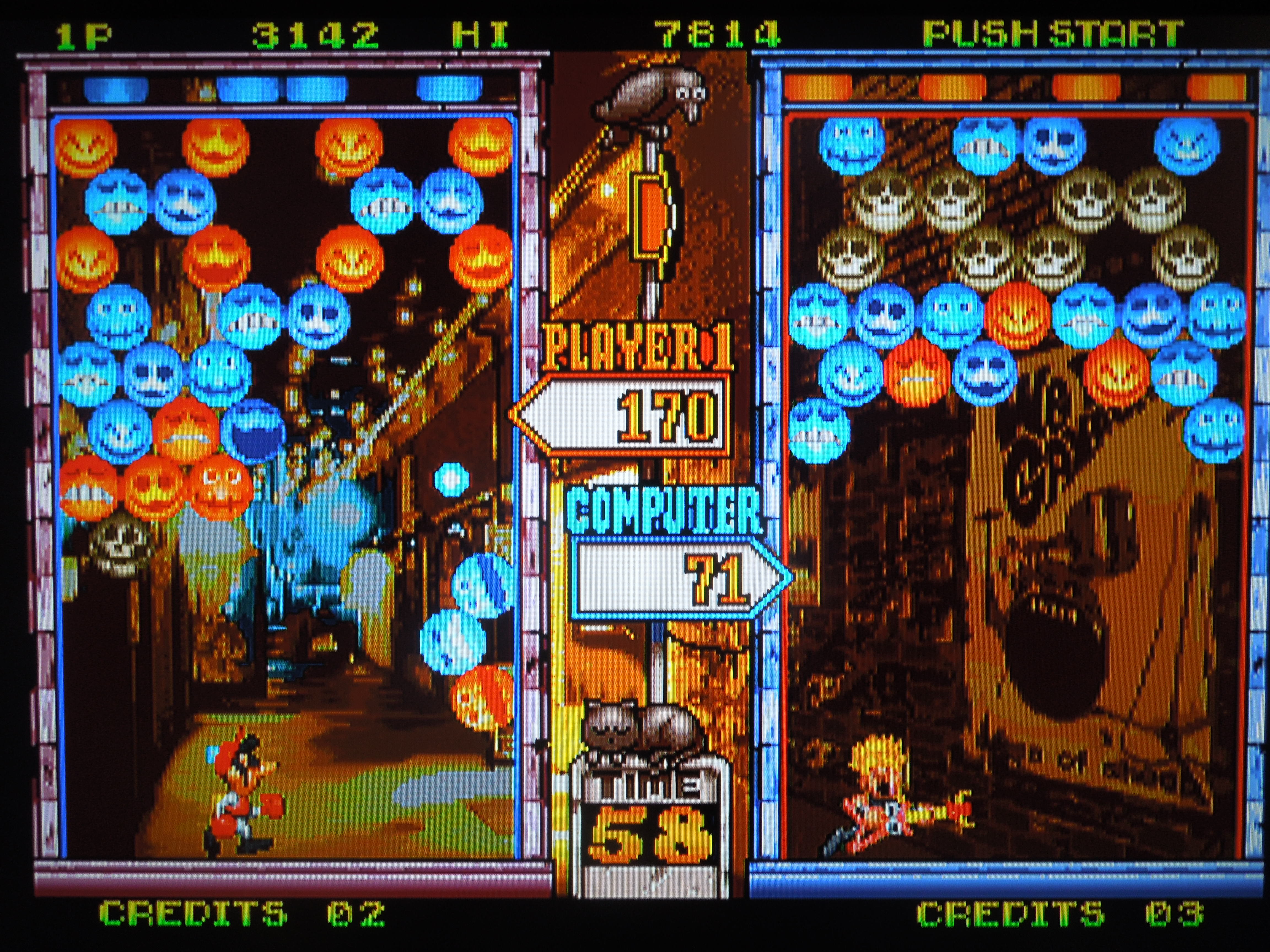Gameplay: In Ghost Lop, you control either Bruce (if your controller is plugged into port 1) or McCoy (if your controller is plugged into port 2) and must engage in 8 ‘battles’ with other characters/monsters to beat the game.  Your goal, during each competitive battle, is to destroy more Red and Blue Ghosts than your opponent.  By destroying the Red and Blue Ghosts, you get particular point totals, and when the clock hits zero, whoever has the most points, wins.  If the clock has been turned off, then the first to 5,000 points wins.  Rounds can end early if the Red or Blue ghosts fill up you or your opponent’s half of the screen (overwhelm you).  Each battle is a Best of 3 Rounds fight.