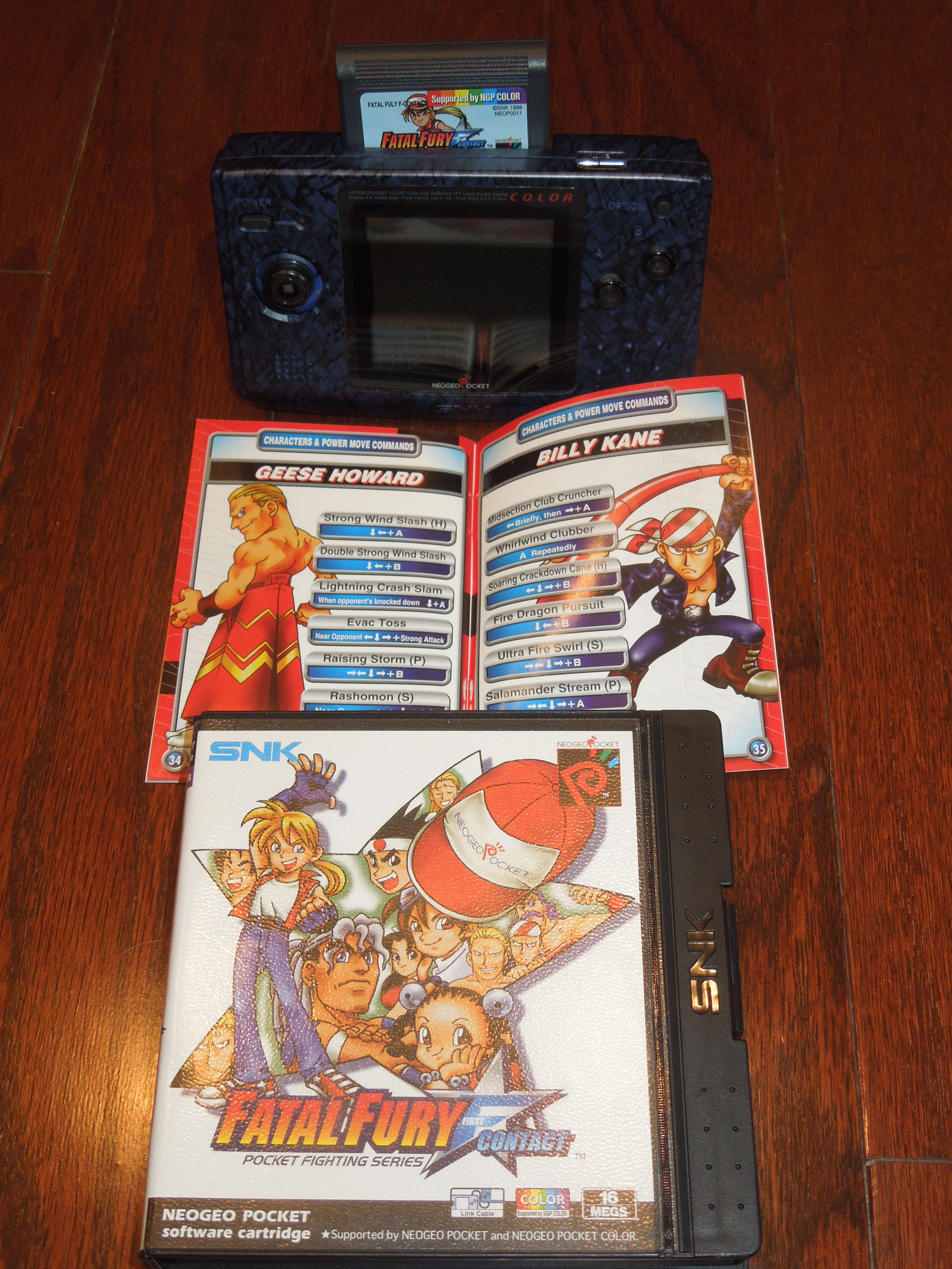 Conclusion:  Fatal Fury: First Contact is one fantastic game.  Honestly, its unfortunate this title was only released as a handheld exclusive because it would look great on the SNES or Sega Genesis, had it ever been released for those systems.  The characters have a somewhat ‘super deformed’ look that is cartoony, and that only helps the game’s presentation – it sets it apart from the many Fatal Fury games that were released for the Neo Geo AES home console.  One thing I really like about First Contact is how easy it is to beat the game with each character (because of the ability to start on any ‘stage’ after you’ve beaten the game on your first run-through).  Also, I like the ability to set the table to your advantage if you lose to the CPU.  Is the CPU tough?  Sure, if you set the Configuration to Hard.  Are the special moves and ‘extra’ moves easy to pull off?  Yes, they are extremely easy to pull off, especially with the Neo Geo Pocket Color’s joystick – I have played the game with all characters, and once you learn each character’s special moves inputs, you’ll be well on your way to mastering the game.  Note:  Either buy a copy of the game that includes the manual (which includes special and extra moves control inputs), or look up the characters’ moves online.