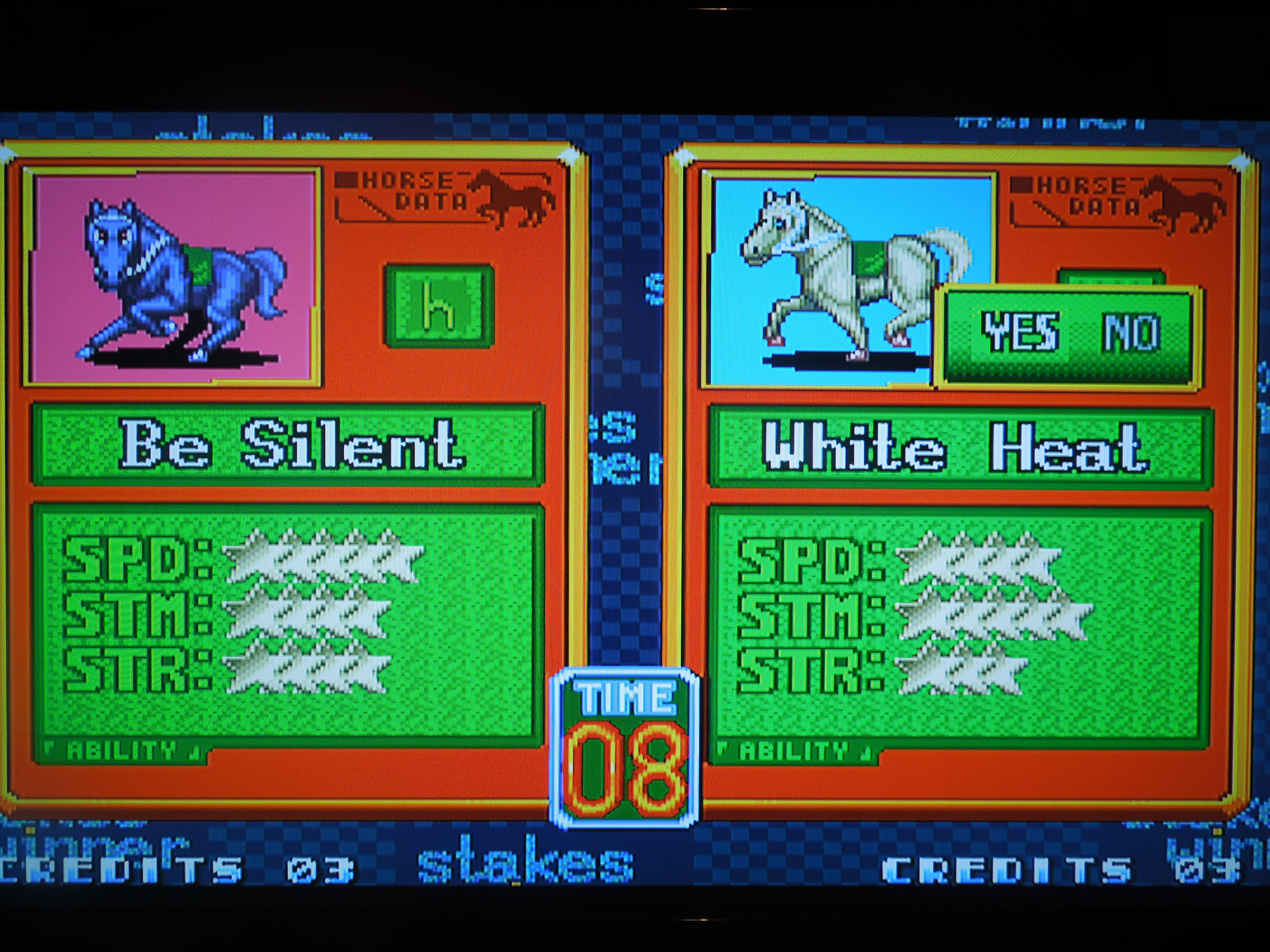 So, where can I find this game? Good luck finding an original U.S. AES copy of Stakes Winner since they’re so rare. There are many MVS arcade copies available however, and some websites on the Internet specialize in professionally converting MVS arcade cartridges to AES home console cartridges. There is also a Neo Geo CD ‘special edition’ version which adds some features, but I believe it is a Japan-only release. You can download the rom for play on a computer, of course.