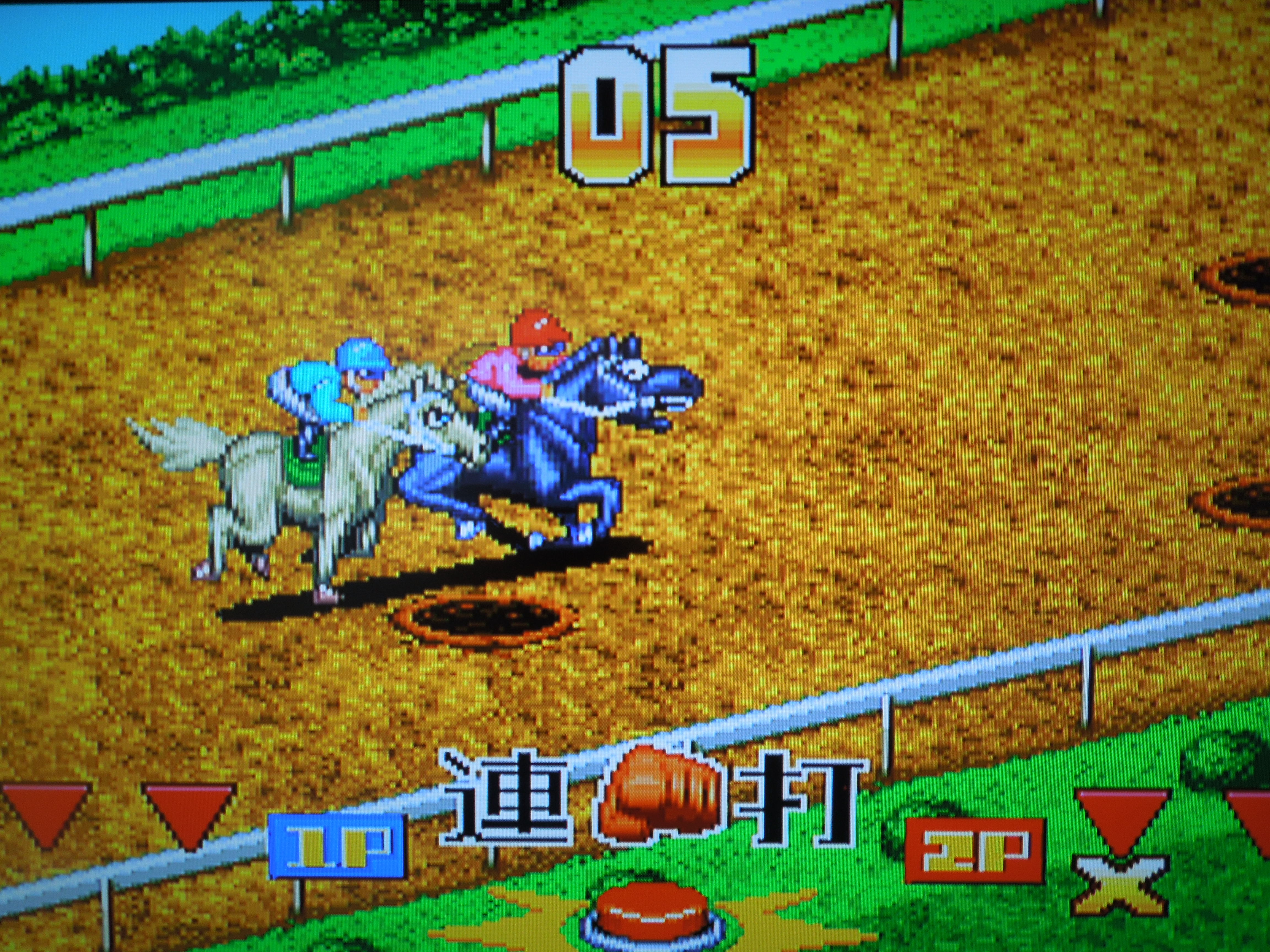 The amount of money you earn serves as your high score.Music & Sound: A digitized version of ‘Camptown Races’ plays during certain parts of the game, adding to the horse-racing atmosphere. During races, catchy tunes play that are appropriate for the sport and compliment the gameplay well. During the end of races, an upbeat and frantic tune plays, letting you know it’s time to start whipping your horse to push hard for the home stretch. The sound effects are well done as well, from the crack of the whip, to the yelling of the jockeys when you bump their horses (which is in Japanese!), to the neighing of the horses.