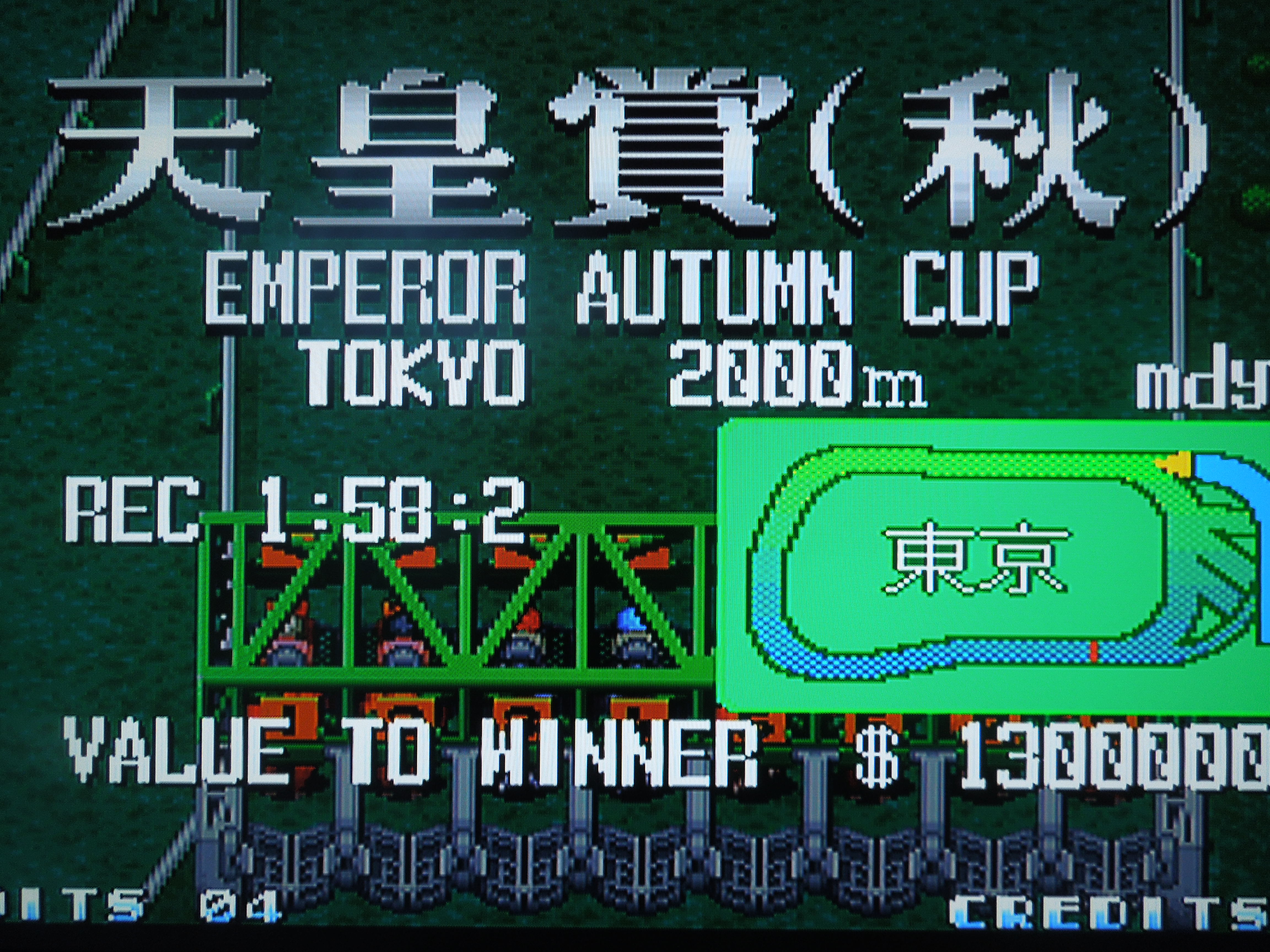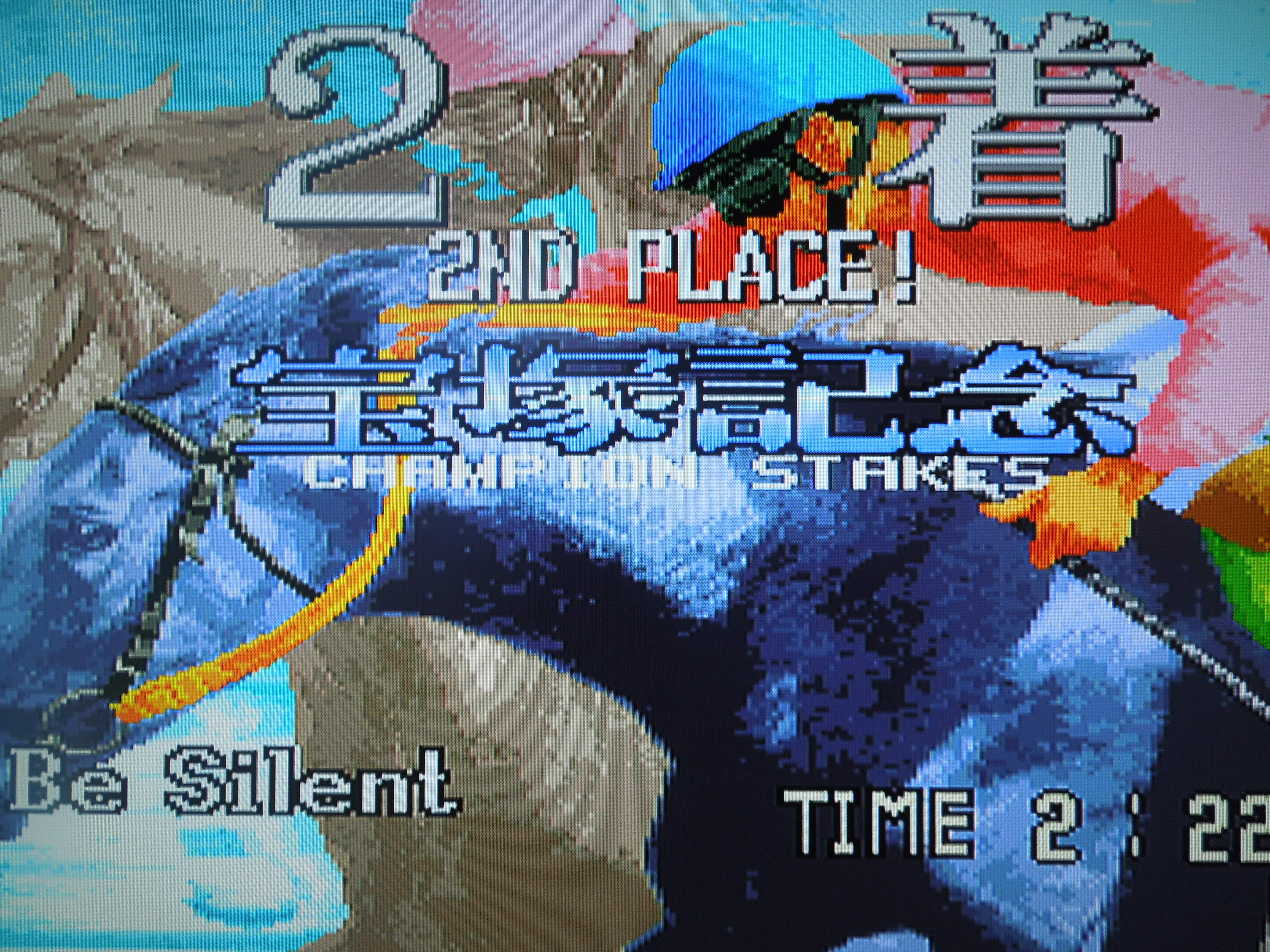 Gameplay: In Stakes Winner, you compete in twelve horse races in Japan. Each race includes 8 horses, and the goal is to finish in the top 3 (preferably 1st) in each race. If you finish in the top 3, you’ll get a pre-determined cash-payout based on your placement. Part of the fun of the game, in addition to the racing, is trying to accumulate as much money as possible (the highest race payout is $1,300,000), making getting a high score part of the game. If you don’t finish in the top 3, you’ll have to use one of your 4 Credits (continues) and try the race again. Use all 4 of your Credits, and it’s Game Over!