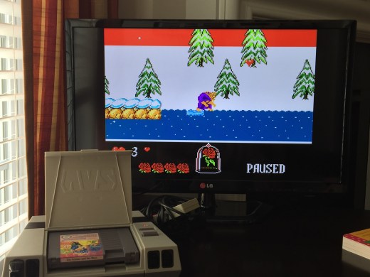 Gameplay: Jump, punch, and growl (freezes enemies) your way through 4 levels to ultimately punch Gaston off the top of your castle, win Belle’s love, and turn back into a human. Each level has multiple parts, many of which require multiple playthroughs to master, but nothing impossible. Beast is clunky to control, but learnable.  The game took me a couple of weeks to beat, playing here and there. The AVS has no save states, or anything like that, which I prefer – gotta beat it the old fashioned way – trial and error, angry words, and perseverance.