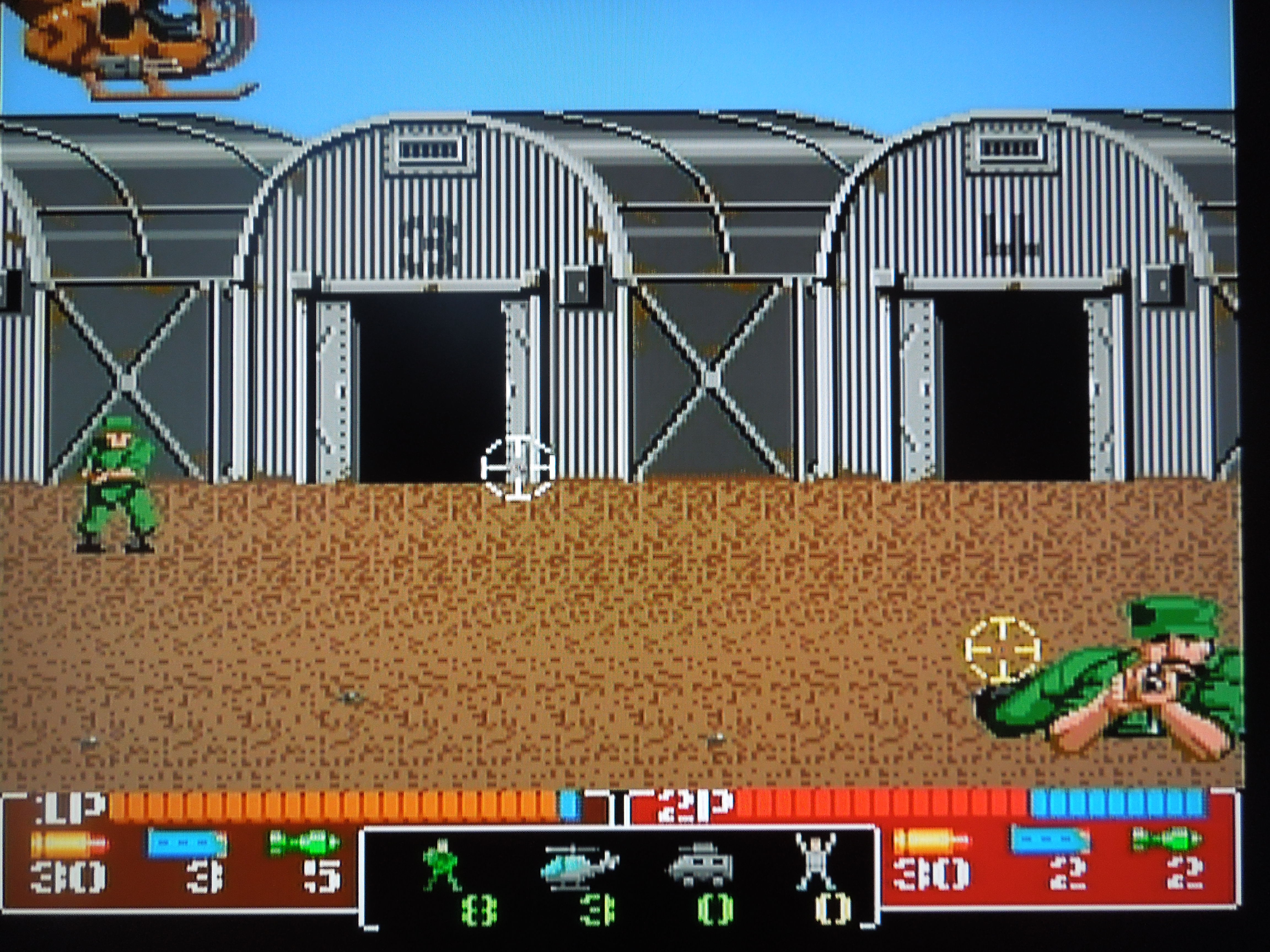 Items:  During each stage, you can collect different pickups to help you complete each mission.  You have to shoot them to acquire them.  Magazines increase the number of bullets you have.  Green rockets increase your rockets by 1.  ‘P’ drinks increase your health by several bars.  ‘FREE’ icons allow you to fire your machine gun for several seconds without losing any ammo.  Dynamite icons kill everything onscreen.  Occasionally, first aid kids will be parachuted down, and these refill your entire life bar.  Sometimes, vultures fly by or coconuts are seen hanging in trees.  Shooting these will release a magazine.