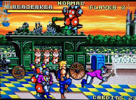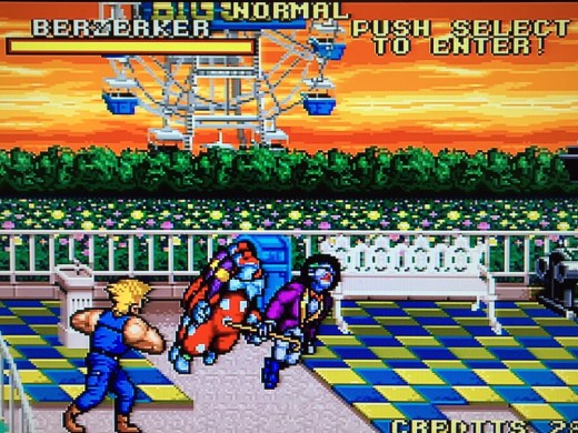 STAGE 1: In the arcade version, you can lift and throw various objects at enemies (motorcycles, go-carts, pinball machines). These are removed from the SNES version.
