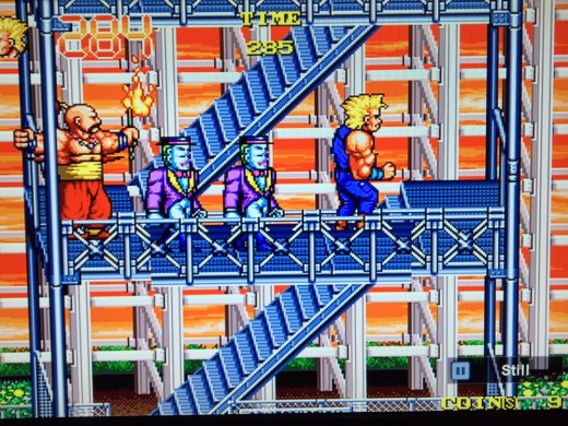 STAGE 1: In the arcade version, you’ll have no trouble sending the motorcycle gang members head first down the stairs. They won’t be coming back, either.