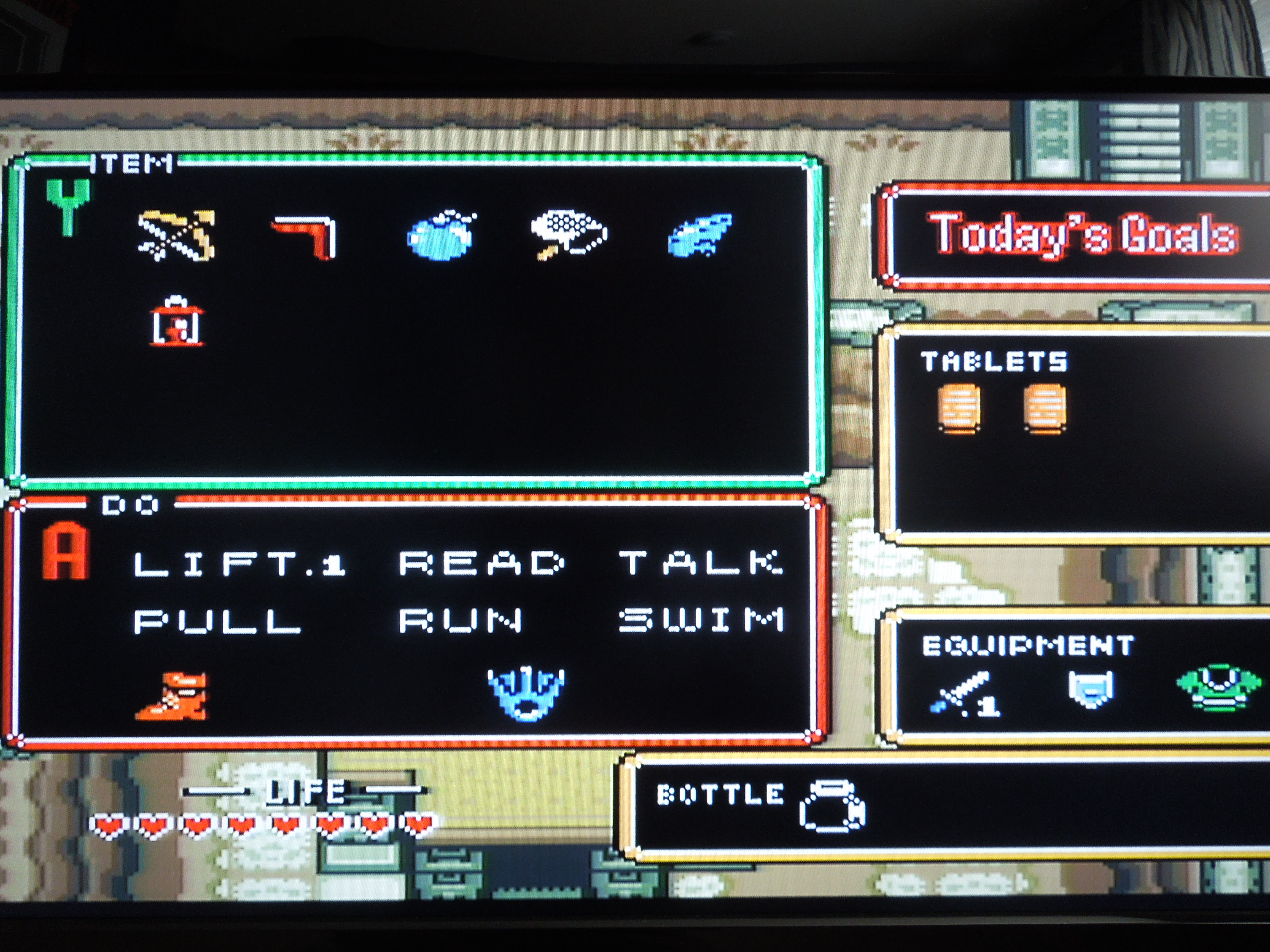 Control: If you’ve ever played Zelda: A Link to the Past for the SNES, this game uses the same control scheme. B swings your sword. Y uses your alternate item (like your bow & arrow or lamp). A dashes once you have the Pegasus Shoes. X opens up the Overworld map or Dungeon map. Start pulls up your menu in order for you to change your alternate items. Pressing R while in the menu pulls up the Week’s (Chapter’s) Goals, showing you everything you are expected to acquire or accomplish during your 50 minutes.